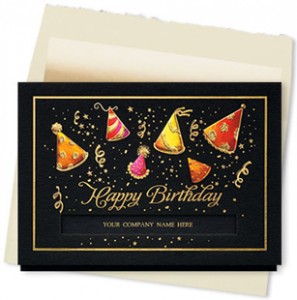 Design #861AY, Party Hats Galore Birthday Card, shows a colorful array of party hats, which is no doubt a stunning way to honor someone on their special day. The embossed hats are highlighted on a midnight black card stock that shows off brilliant bursts of rainbow foil colors in purple, fuchsia, orange, bronze, lemon, and lime, and the unique feature about rainbow foil is that every hat color will appear slightly different on each card so it’s as though you’re getting multiple designs with your business birthday cards. Some of the hats are outlined in rich gold foil to add depth, but every party hat is embossed with its own unique gold foil textured trim directly on the hats.