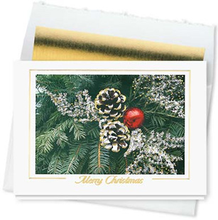 Design #683CX, Fireside Greetings Merry Christmas Card, is an understated Merry Christmas cards design. It is done on cream colored stock with the appearance of water colors. The fireplace mantle is topped with lit candles and a pine garland with small holly berries. The front of the fireplace is donned with well placed red and green stockings waiting to be filled with goodies and a pine wreath with a large red bow. The fire is glowing inside the fireplace giving off a feeling of holiday warmth. Each design element is further outlined in gold foil, which makes them stand out nicely. Fireplaces are the center of the living room, or any room for that matter, and as such they draw families around. Can’t you just picture a lit fireplace with the family all around opening their presents on Christmas morning? Now there is a perfect holiday picture.