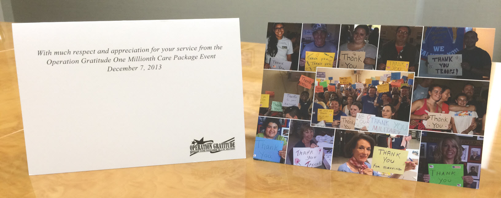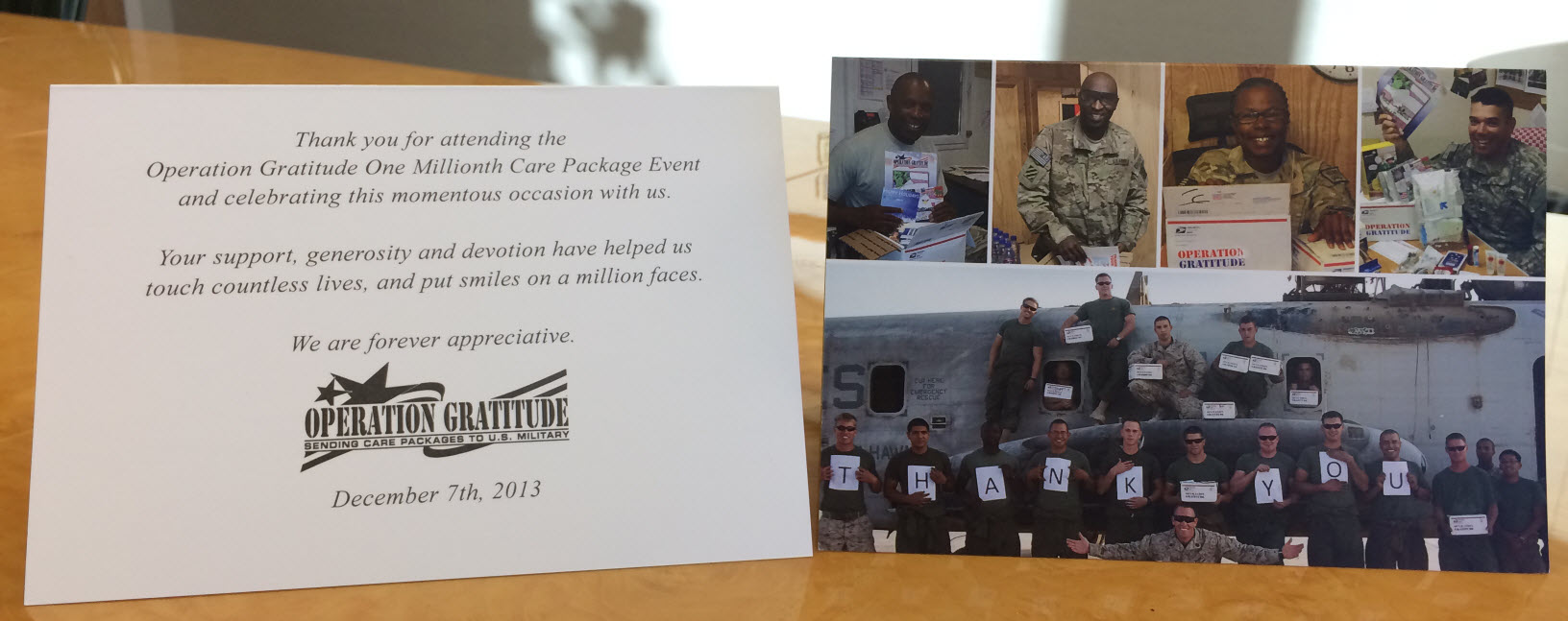 The Gallery Collection has a long history of working with Operation Gratitude. So we were thrilled to donate 7,500 cards to the Operation Gratitude 1 Millionth Care Package Celebration occurring on December 7th, 2013. We’ve created 5,000 specially designed cards to thank everyone attending the celebration for their support of Operation Gratitude over the years.