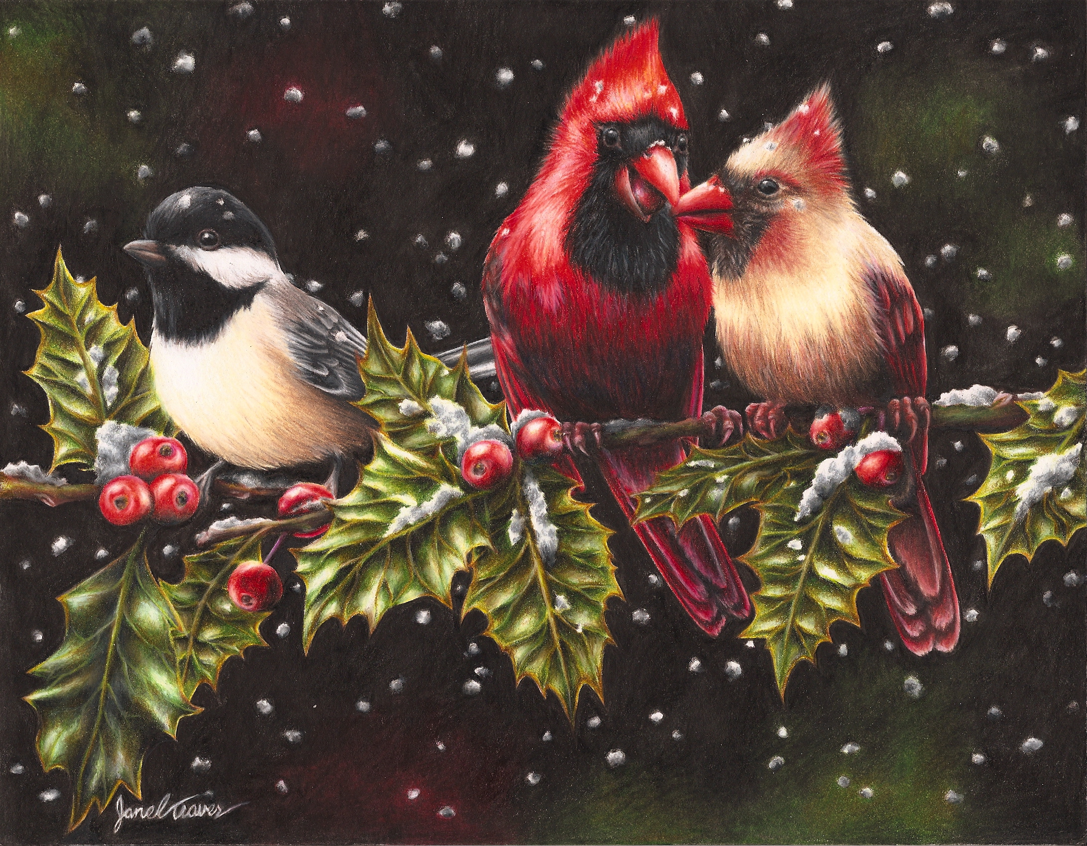 Down south we don’t see much snow so I love winter scenes on my cards-gets me in the mood for Christmas. Those cardinals in the holly tree are gorgeous! Good Luck for the finals.