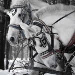 The photo of the two horses is absolutely magnificent! The use of black and white photography with just a hint of burgundy in the reins draws the viewer’s attention to the horses. The horse on the right appears to have its head bowed in prayer while the other horse stands watch. There is almost a subtle feeling of sadness to an otherwise beautiful winter scene.