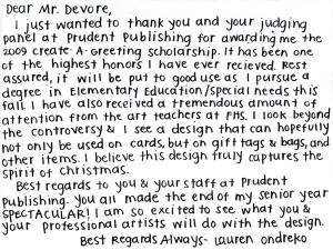 Henry L.onMay 20, 2010 3rd Annual Create-a-Greeting-Card Scholarship Winner Sends Artistic Thanks When our 3rd Annual Create-a-Greeting-Card Scholarship winner Lauren Ondreko was announced, it was met with much celebration and a little bit…